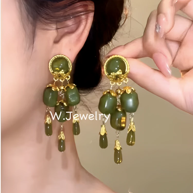复古橄榄绿耳环,金色与绿色搭配的耳环,复古大气,圆润镶嵌搭配流苏的设计,上而灵动又很显大气#耳环控 #精美饰品 #饰品
