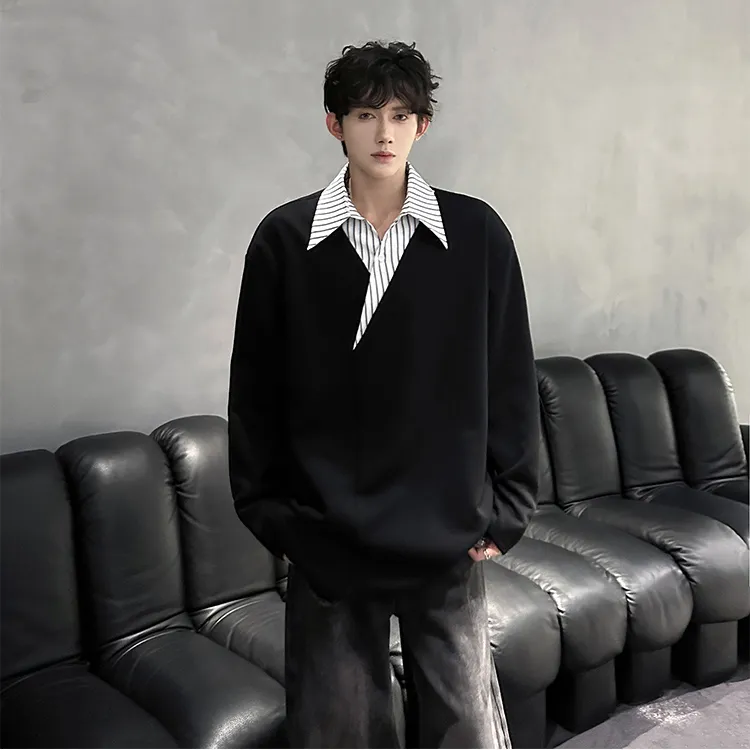 美式假两件拼接设计长袖T恤男春秋高街痞帅宽松内搭休闲翻领上衣 #假二件长袖#休闲上衣#春秋上衣