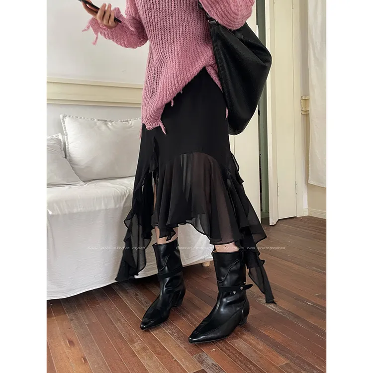 慵懒风 黑色不规则荷叶边半身裙 #慵懒风 #法式浪漫 #穿搭 #秋季新款